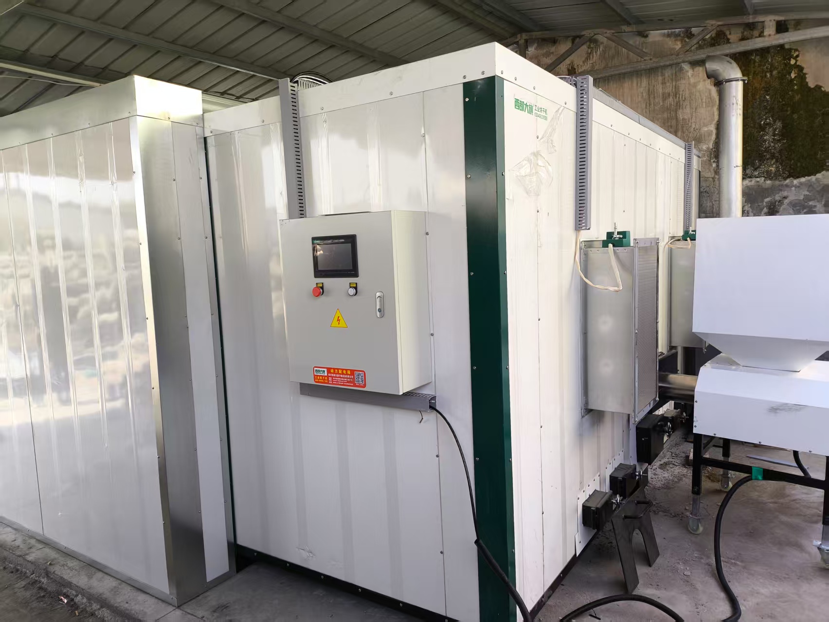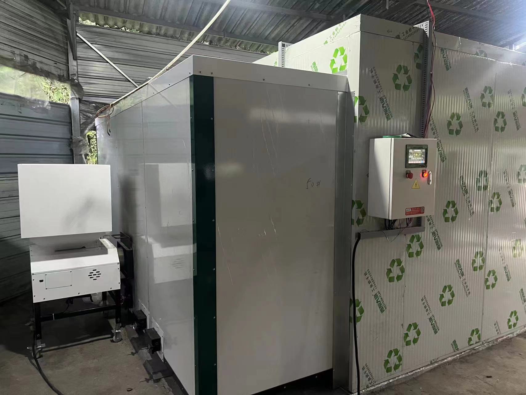 浙江的客户在我厂订购了一套空气能烘干房,用来烘干中药材,可放6辆烘车。热源来自空气能,热效率高,通过驱动压缩机做功实现热量的转移,一度电可当三度电使用。零碳排放;烘房配备的PLC智能控制屏能分阶段控温控湿和实时查看温湿度,支持手机远程控制,智能化操作,无需人工看守。